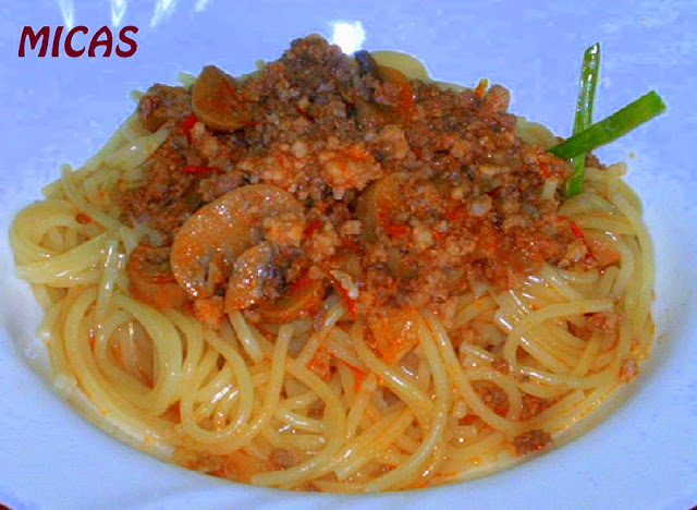 Numa caçarola aloure a cebola e o alho com o tomate picado a margarina e o óleo. Junte a carne e a calda de tomate. Deixe alourar a carne, junte o vinho e os cogumelos, tempere com sal, pimenta, óregãos. Deixe apurar, retire. Leve um tacho ao lume com um pouco de margarina e salteie o esparguete bem escorrido, tempere com sal e pimenta.